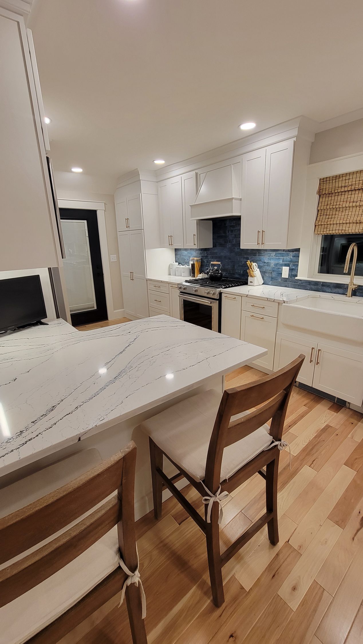 The renovation included enlarging the kitchen and bathroom, adding a first-floor laundry room, and converting an enclosed porch into a mudroom for extra storage. The kitchen was fitted with Diamond Vibe cabinets, a Metallica blue backsplash, Amerock Champagne Bronze pulls, Cambria Portrush quartz counters, and KitchenAid appliances.